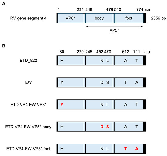 Schematic presentation of the murine RV VP4 gene. (A) Schematic presentation of RV gene segment 4. The 5′ and 3′ UTRs are shown as black boxes. VP8* and the body and foot regions of the VP5* domain in the VP4 gene are shown in light blue boxes. The numbers above the box indicate the amino acid positions. (B) Schematic presentation of the murine RV ETD_822 and EW strains and the VP4 chimeric viruses generated in this study. The five amino acids that differ between the ETD_822 and EW strains are highlighted in red inside the blue boxes. The number above the box indicates the amino acid positions.