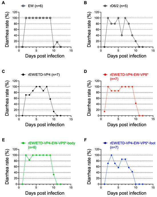 Percentage of diarrhea caused by the wild-type murine RV and recombinant murine RVs. Five-day-old 129sv pups were inoculated with (A) 1 × 103 DD50 of EW, or 1 × 103 FFU of (B) rD6/2, (C) rEW/ETD-VP4, (D) rEW/ETD-VP4-EW-VP8*, (E) rEW/ETD-VP4-ETD-VP5*-body, or (F) rEW/ETD-VP4-ETD-VP5*-foot. The infected mice were monitored for diarrheal stool for 12 days by gentle abdominal pressure.
