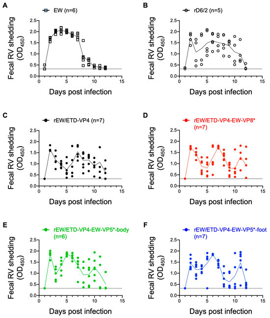 Fecal RV shedding by wild-type murine RV and recombinant murine RVs. Five-day-old 129sv pups were inoculated with the same doses and viruses as in Figure 2. (A) 1 × 103 DD50 of EW, or 1 × 103 FFU of (B) rD6/2, (C) rEW/ETD-VP4, (D) rEW/ETD-VP4-EW-VP8*, (E) rEW/ETD-VP4-ETD-VP5*-body, or (F) rEW/ETD-VP4-ETD-VP5*-foot. The amount of RV in the stool samples was determined by ELISA. Each dot shows data from one pup and the line shows the average score. The dotted lines indicate the score of the limit of detection determined from the stool of uninfected pups.
