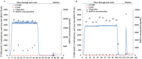The same influenza strain as in the Q study, A/Switzerland/9715293/2013 (H3N2) NIB-88, was used in the development of an SP-based harvest process. As shown in Figure 2A, the viruses in the cell culture supernatant did not bind to SP resins and flowed through an SP column. The equilibration buffer (buffer A) and elution buffer (buffer B) were the same as those used in the Q study. The virus titer in the eluent was only 4 HAUs/50 µL, while the titer in the flow-through (8–44 mL) was between 512 and 1024 HAUs/50 µL (Figure 2A). As a goal of this study was to develop a binding/elution process, the binding of virus particles to SP resins was increased by lowering the ionic strength of the supernatant. By diluting the supernatant with ultrapure water at 1:1, viruses could be captured by SP resins and eluted by buffer B (Figure 2B). It should be noted that to match the diluted load, the concentration of NaCl in buffer A was reduced by half to 0.05 M. The virus titer in the eluent was 4096 HAUs/50 µL (Figure 2B), which was eight-fold higher than that in the load. The virus titer in the flow-through (10–105 mL) was low at 64 HAUs/50 µL or lower (Figure 2B). The DNA mostly stayed in the flow-through, and only a low concentration of DNA was present in the eluent, achieving good separation of DNA and virus particles.
