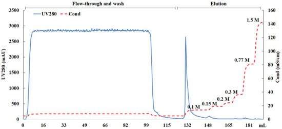 The elution condition was subsequently optimized. With the same 1:1 dilution of the cell culture supernatant, a step elution was carried out with buffer B, as indicated in Figure 3. Viral particles were eluted with 0.1 M NaCl. Consequently, the NaCl concentration in buffer B was reduced from 1.5 M to 0.1 M in subsequent experiments. The lower salt concentration in the eluent had the additional benefit of eliminating the need for a buffer exchange step to reduce the conductivity for the subsequent purification process.