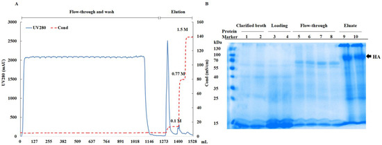 All ion-exchange chromatography experiments were performed on an AKTA purifier 10 liquid chromatography system (Cytiva Corporation, Marlborough, MA, USA). Protein quantification was provided online by a UV detector at a wavelength of 280 nm. The salt concentration/ionic strength was monitored using a conductivity detector. The A/Switzerland/9715293/2013 (H3N2) NIB-88 strain was used to develop and optimize this method, and the six remaining strains were used to validate its general applicability. The flow rate of the whole process was 1 mL/min.