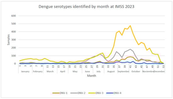 Dengue serotypes identified in 2023 by week at IMSS 2023.