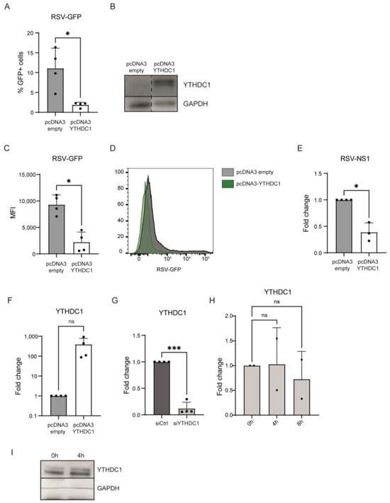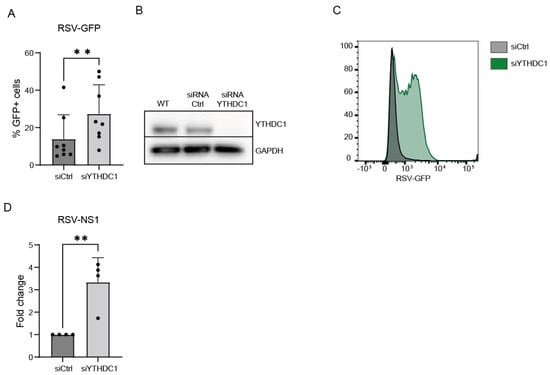To validate that YTHDC1 manipulation affects RSV viral load, a siRNA-mediated knockdown approach was used. Endogenous YTHDC1 knockdown was performed in A549 cells, RSV-GFP virus was administered, and RSV viral load was measured by flow cytometry and qPCR. Knockdown of YTHDC1 resulted in an increased amount of RSV-GFP-positive cells and RSV-NS1 mRNA expression (Figure 1F,G and Figure 2A–D). Altogether, these data indicate that YTHDC1 suppresses RSV infection or replication.