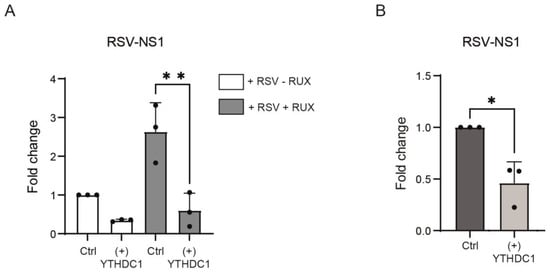 YTHDC1 acts independently of the type 1 interferon response. (A) A549 cells with overexpression of YTHDC1 or control vector were treated with 1 uM Ruxolitinib or DMSO and were infected with RSV-GFP. RSV-NS1 expression was measured with qPCR. p-values were calculated using a paired t-test, ** p < 0.01. (B) Vero cells YTHDC1 overexpression were treated with RSV-GFP for 72 h. RSV-NS1 expression was measured with qPCR. p-values were calculated using a paired t-test, * p < 0.05, n = 3.