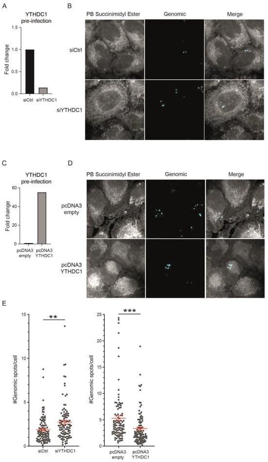 To determine whether YTHDC1-mediated differences in viral load are the result of decreased RSV infection of host cells, we performed single-molecule RNA fluorescence in situ hybridization (smFISH) with probes against genomic RSV RNA 2 h post-infection []. This technique allows for visualization of early RSV infection. We found a negative correlation between YTHDC1 expression and the number of RSV-infected cells (Figure 4A–D). Knockdown of YTHDC1 resulted in an increased number of smFISH spots per cell, while a reduced number of spots per cell was observed upon overexpression of YTHDC1 in the host cells (Figure 4E). These data demonstrate that YTHDC1 manipulation affects viral infection already 2 h after infection. Because the amount of genomic RNA transcripts is affected early in infection, these results indicate a role for YTHDC1 in the regulation of viral entry.