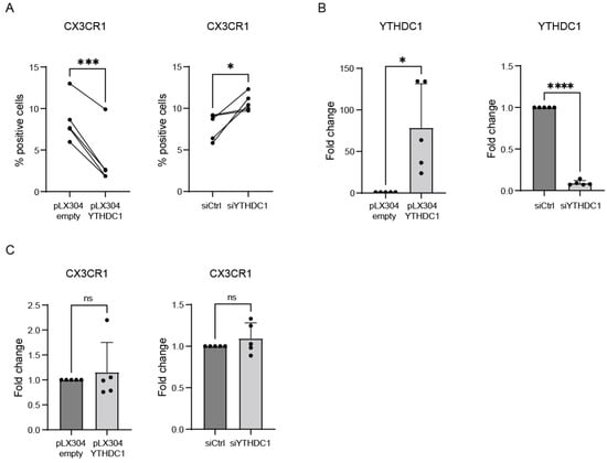 As we observed that YTHDC1 reduced RSV viral load early after infection, we next investigated the mechanism behind this observation. We hypothesized that YTHDC1 might affect the expression of RSV entry receptors and, specifically, CX3CR1. Overexpression of YTHDC1 significantly decreased the percentage of cells expressing CX3CR1 on the cell surface as measured by flow cytometry on non-permeabilized cells, and opposite effects were seen for YTHDC1 knockdown (Figure 5A,B). Strikingly, manipulation of YTHDC1 did not result in significant CX3CR1 mRNA expression changes, illustrating that the YTHDC1-dependent changes in CX3CR1 surface expression are not the result of altered transcription or RNA degradation (Figure 5C). Altogether, these data indicate that YTHDC1 can modulate the expression of RSV entry receptor CX3CR1 on the surface of lung epithelial cells, thereby hampering RSV entry.