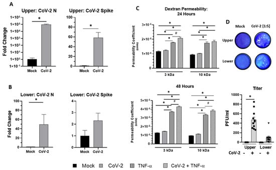 Transwell BBB model is infected in both compartments by SARS-CoV-2 while maintaining paracellular integrity. (A,B) qPCR analysis of mRNA of N and spike in the upper (HUVECs) and lower wells (astrocytes and pericytes) of the model. (C) The permeability coefficient of passive diffusion of 3 kDa and 10 kDa fluorescent dextran molecules placed in the upper compartment of the BBB model to the lower compartment 24 hpi and 48 hpi. The raw reads of fluorescence were converted to a permeability coefficient using Equation (1) mentioned above. (D) Representative images of plaque assays and their corresponding dilution factor. Supernatants from the upper and lower compartments of the transwell were sampled at 48 hpi and measured in a plaque assay with infectious viral titer being reported in PFU/mL. #, * p < 0.05 using Student’s t-test or One-Way ANOVA and subsequent post hoc analysis with Fisher’s LSD Test.