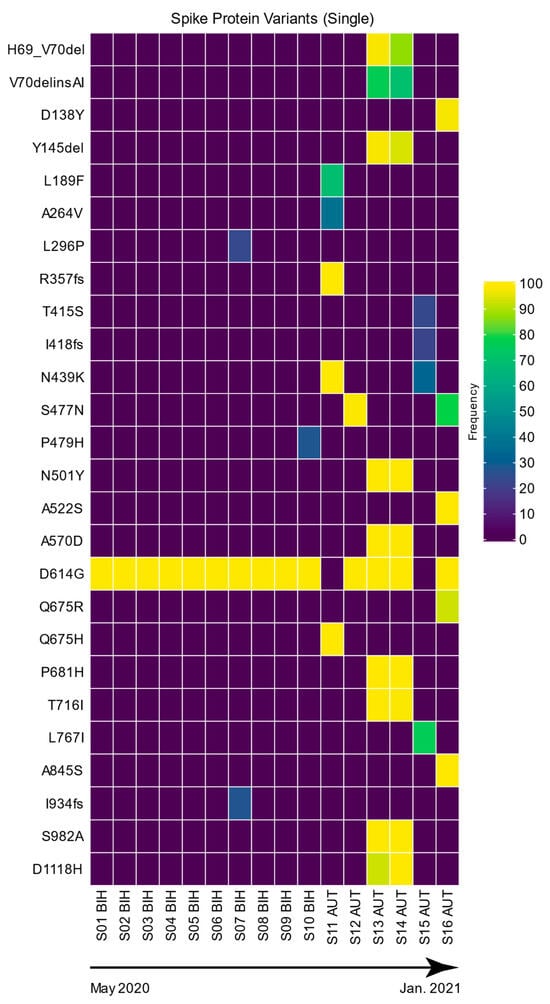 From analyzing SARS-CoV-2 metagenomic sequences derived from single-patient samples, we observed a high intra-patient sequence variability (see Figure 1). While most variants were supported by nearly 100% of the mapped reads (frequency) at individual positions, some mutations were supported only at lower persistence rates. We detected six mutations that showed intermediate sequence variability with 40–90% frequency (mapped reads). Another seven positions showed high sequence variability with frequencies between 20 and 40% within individual patients. Besides detecting intra-patient sequence variability, we also detected sequence variability between individuals. While some mutations occurred only occasionally, others were found at much higher frequencies (Figure 1). Mutation D614G, for example, was present in 14 out of 16 patients at a persistence rate of more than 99.8% of the total reads covering this position. Interestingly, a distinct pattern is also visible in two single samples from Austria (S13 and S14; Figure 1), easily identifying the Alpha variant (known as 20B/501Y.V1, VOC 20201s2/01, or B.1.1.7 lineage) by the combination of mutations HV69-70del, Y144del, N501Y, A570D, D614G, P681H, T716I, S982A, and D1118H, with the addition of I68I and V70delinsAI in all of these single samples. The mutation N439K is common to both single samples from Austria S11 and S15, and sample 12A had two mutations, and these are in common with sample S16 (S477N and D614G; Figure 1). Moreover, the Austrian sample 16A had several mutations mirroring the lineage B.1.1.317 (PMVL-43, S: D138Y, S477N, A522S, D614G, Q675R, A845S; hCoV-19/Russia/MOW-PMVL-43/2021).