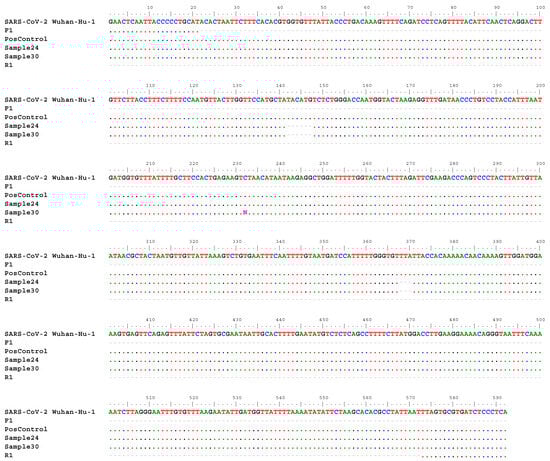 Nucleotide sequences where deletions were observed after PCR, confirming variants that were present in the pool and previously detected with NGS. In the alignment, the reference genome (SAR-CoV-2 Wuhan-Hu-1), forward primer (F1), positive control (PosControl), Sample 24, Sample 30, and reverse primer (R1) sequences are included.