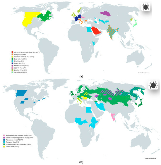 Geographical distribution of tick-borne infections, including areas of endemic and imported cases involving nervous system symptoms. The division into blocks (a,b) was implemented to enhance the visualization of data on the maps; information about the taxonomic groups located on each block is provided in the legend within the pictures, as well as in the main text alongside the first mention of the corresponding virus. Maps were created with the Map Chart online map-making tool (https://www.mapchart.net/index.html, accessed on 7 May 2024); Graphic objects were created with the BioRender online science illustration making tool (https://www.biorender.com/, accessed on 7 May 2024). The images may contain slight inaccuracies in depicting the boundaries of virus distribution areas due to the limitation of the map scale and the choice of scientific sources utilized to create these illustrations.