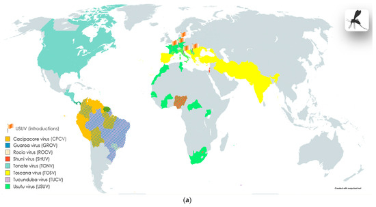 Kunjin virus (KUNV) (Table 2, Figure 2e) is found in Australia and Oceania, like MVEV, severe manifestations of this rare infection can include encephalitis [133,134]. Usutu virus (USUV) (Table 2, Figure 2a) is distributed throughout the African continent, but has also been detected in European countries. The transmission cycle of the virus includes small insectivorous bats, rodents, and shrews; the virus is transmitted by Culex annulirostris mosquitoes [135,136,137,138].