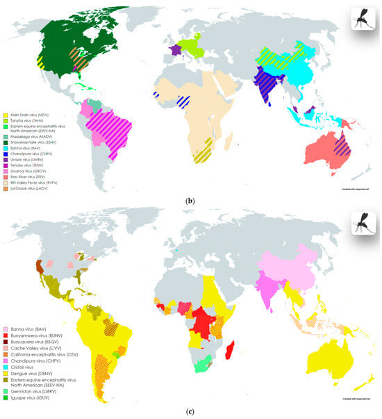 Cache Valley virus (CVV) (Table 2, Figure 2c) is reportedly circulating in several states in the United States; the main vectors of the virus are mosquitoes of the genus Culex. In humans, the manifestations of infection can include brain lesions (meningitis, meningoencephalitis, and encephalitis) [149,150,151,152].