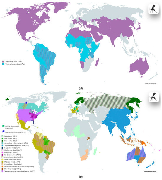 Japanese encephalitis virus (JEV) (Table 2, Figure 2e) is transmitted through the bite of Culex spp. The endemic area for the spread of the virus is the Asia–Pacific region. The virus circulation cycle is associated with wild waterfowl and domestic animals [120]. According to the WHO, the annual number of cases of the disease reaches 70 thousand, and the mortality rate is estimated at 20–30% [120].