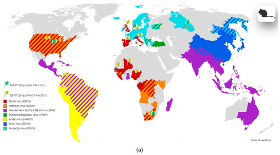 Alkhumra hemorrhagic fever virus (AHFV) (Table 1, Figure 1a) can also be transmitted to humans through soft tick (Ornithodoros savignyi or “Sand tampan”) and hard tick (Hyalomma dromedarii) bites [71]; however, the possibility of transmission of the virus through mosquito bites and in a food-borne way has also been reported. The Middle East region is recognized as the predominant area for the spread of the virus and its vector [71,72]; AHFV was first isolated from a patient in Mecca (Saudi Arabia), in the mid-1990s [71]. Symptoms of the disease include fever and headache; severe complications are represented by hemorrhagic manifestations and encephalitis, and the mortality rate of the disease is about 20–25% [72,73,74].