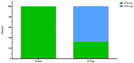 Proportionate distribution of sera determined as positive or negative in IIFA for negative and positive neutralization test (NT) results.