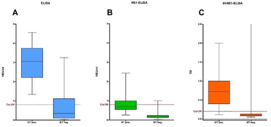 Distribution of Vienna units (VIEU)/mL determined by ELISA (A) and NS1 ELISA (B) or OD determined by IH-NS1 ELISA (C) for negative and positive neutralization test results (NT). The cut-off of each assay is shown as a red dashed line.