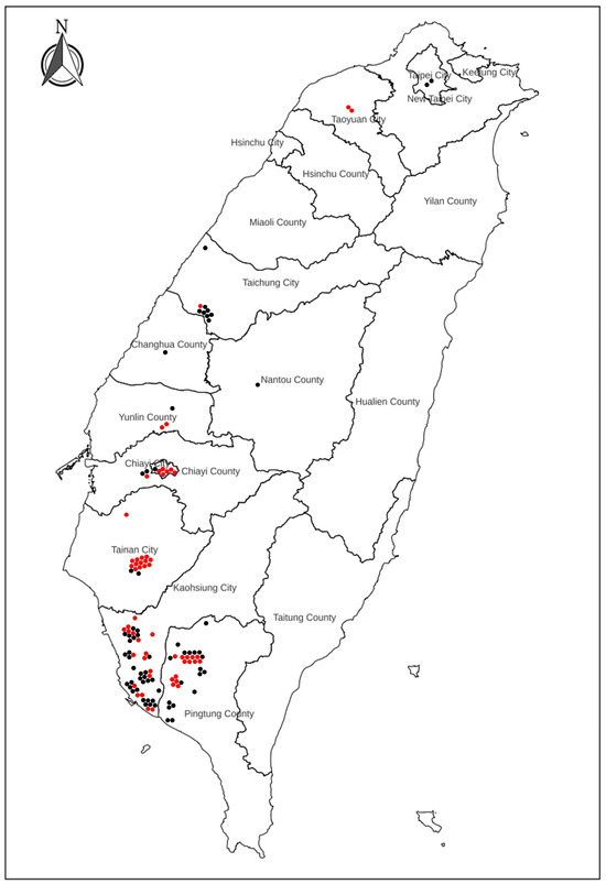 The map shows the geographical location of PaBV-positive (red dots) and PaBV-negative (black dots) psittacine birds in Taiwan; map was sourced from the National Land Surveying and Mapping Center (NLSC).