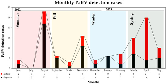 PaBV detection cases per month (June 2022 to May 2023); PaBV-positive case are in red while PaBV-negative cases are in black.