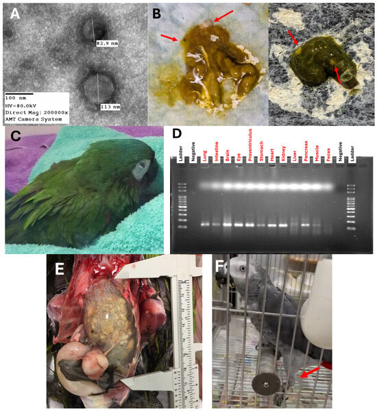 (A) Transmission electron microscopy image of the PaBV at 200,000× magnification, with a diameter of 82.9 nm and 113 nm. (B) Feces droppings with shedding of undigested seeds (red arrow). (C) Red-shouldered macaw (Diopsittaca nobilis) suffering from proventriculus dilation and showing neurological signs; discomfort can be seen in the twitching of the eyes. (D) Gel band image of the RT-qPCR product, 125 bp, for PaBV detection in lung, intestine, brain, eye, proventriculus, stomach, heart, kidney, liver, pancreas, muscle, and feces samples from case number 2301024. (E) Dilated proventriculus with a thin wall containing undigested seeds, about 6 cm in length, of a red-shouldered macaw (Diopsittaca nobilis) enduring proventriculus dilatation disease. (F) Photo of an African grey parrot (Psittacus erithacus) unable to balance right before it fell due to loss of control of the left leg (red arrow).