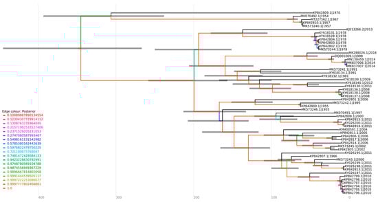 The optimal substitution model for the alignment was assessed using ModelFinder in IQ-TREE v2.1.4-beta (GTR + F + I + G4), generating a maximum likelihood tree. Root-to-tip correlation (>0.8) for the consensus tree was inspected in TempEst v1.5.3 with best-fitting root and residual mean square function, suggesting a strict molecular clock. The alignment was then imported into BEAUti v1.10.4 using tip dates parsed (year only) from the sequence names. The GTR substitution model was selected with empirical base frequencies and gamma (4 categories) plus invariant sites. We selected a strict clock type and a coalescent tree, previously, with constant size, and a random starting tree. Other parameters remained unchanged. Further, a Markov chain Monte Carlo with 100 million interactions using BEAST v1.10.4 was performed, logging the results at every 1000 interactions. The convergence of the model parameters was inspected using Tracer v1.7.2, confirming that the ESS for each statistic was >400 at the end of the runs. Tree annotator v1.10.4 was then employed to generate a maximum clade credibility tree with median heights for all trees generated, following the removal of the first 10% as burn-in. The final tree was inspected, and a figure was generated using IcyTree [18].