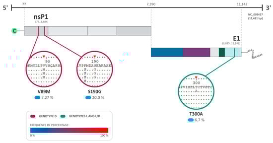 In addition, amino acid substitutions identified in the genomic regions of the nsP1 of sequences of genotype D were found to be under positive selection pressure (Figure 2, Supplementary Table S2), suggesting the possible viral adaptability and improvement of fitness during viral replication. The nsP1 protein is directly involved in the initiation of virus replication, responsible for interacting with the inner face of the plasma membrane and promoting the formation of the spherules, which are vesicles where the replicative process initiates [38]. Even though the presence of polymorphisms by positive selective pressure is relevant due to its impact on virus evolution, the low level of positive selection suggests that the amino acid changes have been a result of random genetic drift. Interestingly, the same pattern was seen in other RNA viruses such as the West Nile virus and Hepatitis C virus [39].