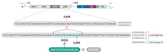 The insertion of the amino acids ACQDT (nucleotide sequence: AGCGTGCCAAGACAC) between the amino acid positions 443–444 of the nsP3 was found in three sequences already described as L/D (KX496990.1—Haiti, 2015; KT818520.1—Brazil, 2014; and KY985361.1—Haiti, 2014) (Figure 7). Interestingly, the isolate KM400591.1 (Brazil, 2014), classified as MAYV genotype D, also presented the same insertion and was identified as a minor parent for the heterologous hybrid KX496990.1 (Haiti, 2015), which also presented this characteristic.