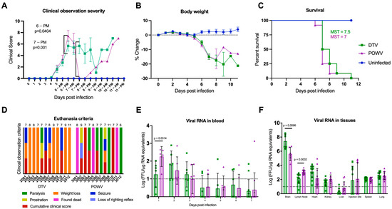 Clinical presentation of DTV and POWV infections. Mice (n = 12 per group) were inoculated via the footpad with 103 FFU of media (blue circles), DTV (green squares), or POWV (purple triangles) and monitored for signs of disease for up to 11 dpi. (A) Clinical signs of disease were categorized and scored by severity (Table S1). Significant differences in DTV and POWV mice clinical scores occurred at the PM observations on 6 dpi and 7 dpi. (B) Percent weight change from pre-infection. Comparisons on (A,B) were made using one-way ANOVA with Šίdάk multiple comparisons test. Error bars indicate SEM. (C) Survival of mice across all treatments were evaluated using the Mantel–Cox log-rank test and median survival times (MST) were calculated. (D) Humane euthanasia was performed when mice met specific criteria. The cause(s) of mortality were summarized for each animal to demonstrate differences between DTV and POWV. Each colorized bar indicates the reason(s) for euthanasia. The numbers above the bars indicate the day of euthanasia post-infection. (E,F) Blood was collected from alternating cohorts of male (n = 3) and female (n = 3) mice from 0 to 7 dpi and at termination blood and tissues (brain, popliteal lymph node, heart, kidney, liver, injection site, spleen, and lung) were collected from all animals to determine viral loads via rt-qPCR. For brain analysis, six animals per group (3M and 3F) were tested and for all other tissues twelve animals (6M and 6F) were tested. Viral loads are expressed as Log FFU equivalents per microgram of RNA after normalization to a standard curve. Comparisons on (D,E) were performed using two-tailed Student’s t-test with Welch’s correction. For statistically significant comparisons, p-values are provided on the figure panels.