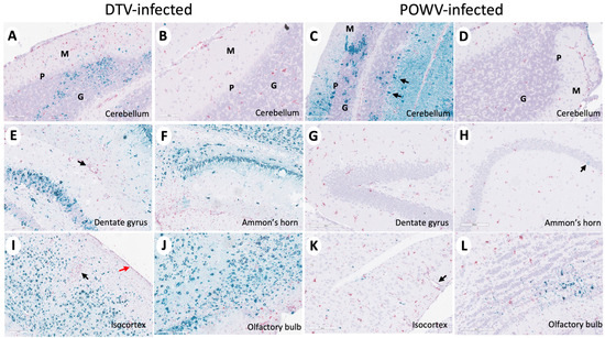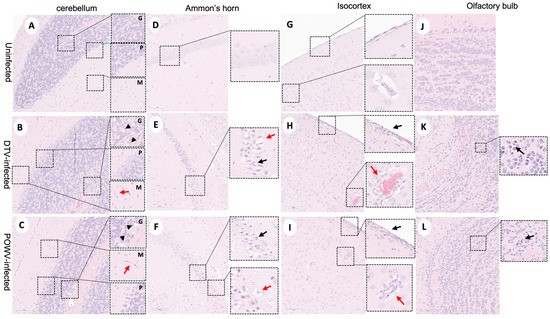 Neuropathological examination of DTV- and POWV-infected mouse brains. Brains were harvested at the time of euthanasia. Uninfected mouse with normal structures shown in (A) cerebellum with insets showing molecular cell layer—M, Purkinje cell layer—P, and granular cell layers—G, (D) Ammon’s horn of the hippocampus, (G) isocortex, and (J) olfactory bulb. Cerebellum of DTV- (B) and POWV- (C) infected mice with microgliosis (inset, red arrow) and neuronal cell necrosis (inset, black arrowheads). Ammon’s horn of the hippocampus from DTV- (E) and POWV- (F) infected mice with neuropil vacuolation (inset, red arrow) and hyper eosinophilic degenerating neurons (inset, black arrow). Isocortex of DTV (H) and POWV (I) with infiltration of leptomeninges (inset, black arrow) and perivascular cuffing (inset, red arrow). Olfactory bulb of DTV- (K) and POWV- (L) infected mice with neuronal cell necrosis in granular cell layers (black arrow).