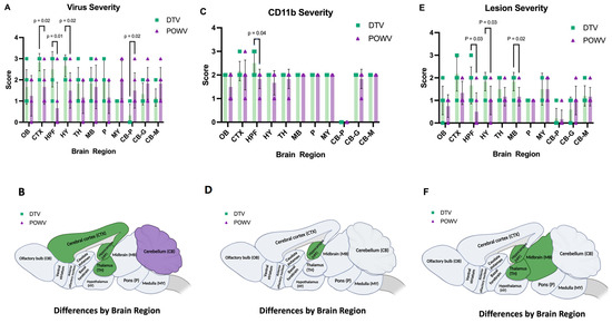 Severity of virus, CD11b, and lesions in DTV- and POWV-infected mouse brains by region. Brains were harvested at the time of euthanasia. (A) Virus severity in individual mice by region and (B) brain regions of DTV-infected mice had statistically more virus severity in CTX, HPF, and TH while POWV-infected mice had more virus severity in CB. (C) CD11b severity of individual mice by region. (D) Brain regions of DTV-infected mice had statistically significant increases in CD11b positive cells in HPF. (E) Severity of individual mice by region. (F) Brain regions of DTV-infected mice had statistically significant differences in severity in the HPF, MB, and TH regions. All comparisons performed using unpaired two-tailed Student’s t-test with Welch’s correction. For statistically significant comparisons, p-values are provided on the figure panels.