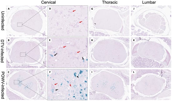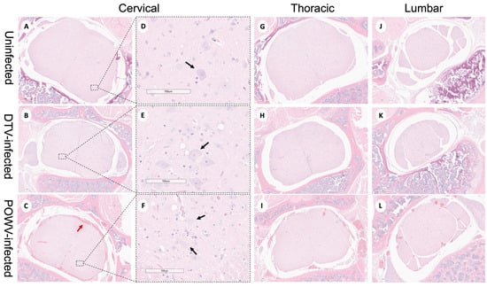 Neuropathological examination of DTV- and POWV-infected mouse spinal cords. Spinal cords were harvested at the time of euthanasia. Uninfected mouse with normal structures shown in (A,D) the cervical region (black arrow shows motor neuron in ventral horn), (G) thoracic region, and (J) lumbar region. DTV-infected mouse (B) cervical region, (E) motor neuron (black arrow) in dorsal horn, (H) thoracic region, and (K) lumbar region. POWV-infected mouse with (C) meningoencephalitis (red arrow) in cervical region, (F) absent and degenerating motor neuron (black arrow) in dorsal horn, and infiltrations in (I) thoracic and (L) lumbar regions.