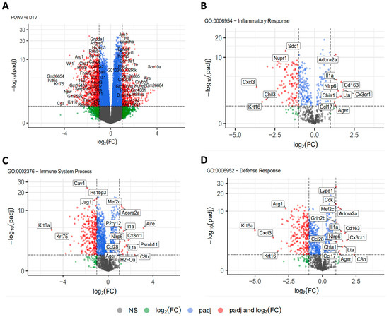 RNA sequencing analysis of brain tissue. Brains were harvested at the time of euthanasia and stored in trizol before homogenization and RNA extraction followed by RNA-Seq. Transcript libraries were analyzed using R with (A) POWV compared to DTV. Genes were separated into smaller gene ontology sets and compared for (B) inflammatory response, (C) immune system process, and (D) defense response.