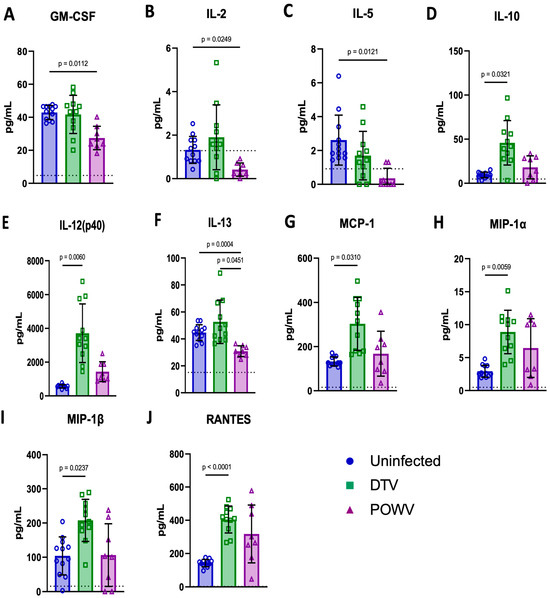 Cytokine and chemokine levels were measured in terminally collected serum from uninfected (n = 6M/6F), DTV-infected (n = 5M/6F), and POWV-infected (n = 3M/5F) mice by Bio-Plex Mouse Cytokine 23-plex panel. Significant differences were present between uninfected and POWV-infected mice for four parameters (A,B,C,F), between uninfected and DTV-infected mice for six parameters (D,E,G,H,I,J), and between DTV- and POWV-infected mice for one parameter (F). Comparisons were made using Brown–Forsythe and Welch’s ANOVA test with Dunnett’s T3 multiple comparisons test. The horizontal dotted lines in the individual graphs represents the limit of detection for each of the cytokines and chemokines.
