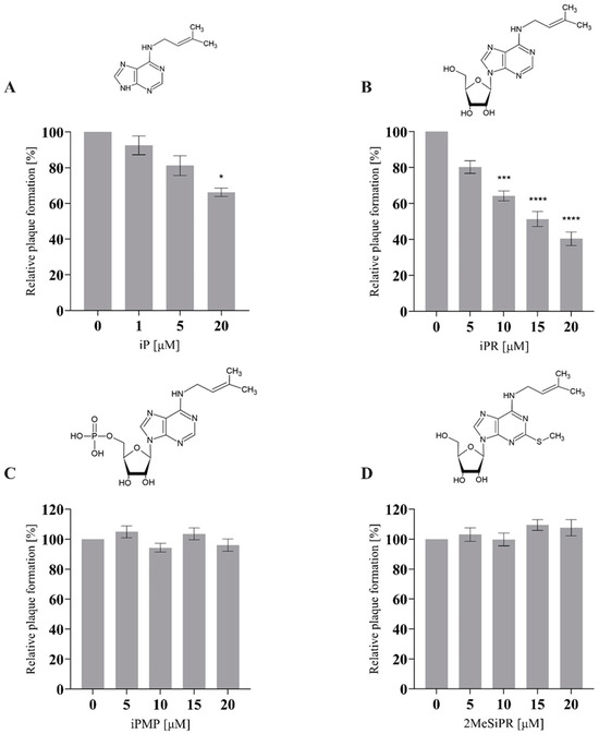 The effects of exogenous cytokinin application (0–20 µM) during FV3 replication were assessed by plaque formation assay (Figure 2). iP and iPR significantly reduced the number of plaques formed relative to controls during FV3 infection. iP significantly reduced plaque formation by 33.8% (p = 0.0315) at 20 µM. iPR significantly reduced plaque formation by 36.8% (p = 0.0005), 48.6% (p < 0.0001) 59.6% (p < 0.0001) at 10, 15, and 20 µM, respectively. No significant changes in relative plaque formation were observed when iPMP or 2MeSiPR were applied during infection (Figure 2).
