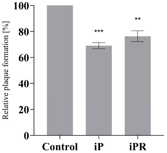 Additionally, 20 µM of iP or iPR were applied 12 h prior to infection to assess the importance of treatment timing (Figure 3). Following cytokinin treatment, the supernatant was removed, EPC cells were washed with PBS, and then infected with FV3 at an MOI of 0.02 PFU/mL for 24 h. As observed in concurrent treatments, plaque formation was significantly reduced by pre-treatment by 31% (p = 0.002) and 23.75% (p = 0.0026) for iP and iPR, respectively. Furthermore, no cytotoxicity or changes in proliferation were observed for these compounds as determined using cell viability assays (Table S1).