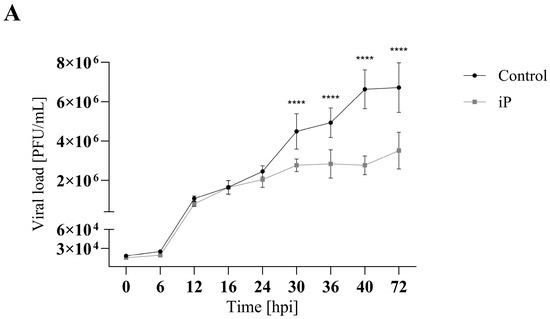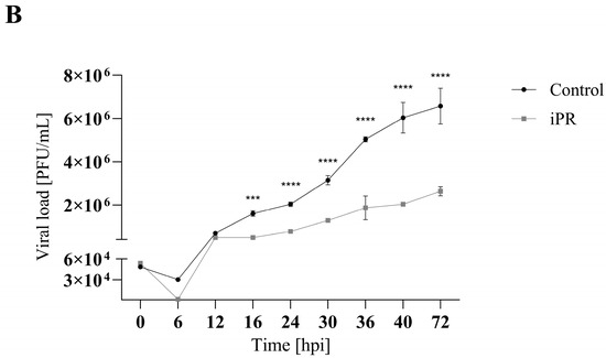 iP and iPR begin to reduce FV3 titers at 30 and 16 h post infection, respectively. Equivalent numbers of EPC cells were simultaneously infected with FV3 at an MOI of 5 and either (A) 16.5 μM of iP or (B) 16 μM of iPR. The virus was harvested at the indicated time points and quantified in triplicate by plaque assay. Data are presented as mean PFU/mL ± SD. Statistical significance was evaluated using a two-way ANOVA followed by a Bonferroni post hoc test (n = 1; *** p ≤ 0.001, **** p ≤ 0.0001).