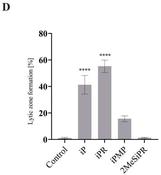 In 6-well plates, 1.7 × 106 EPC cells were seeded using L-15 media supplemented with 10% FBS to form confluent monolayers. EPC cells were concurrently infected with FV3 at an MOI of 0.02 PFU/cell in L-15 supplemented with 1% FBS and iP, iPR, iPMP or 2MeSiPR (0–20 μM) for 24 h. Controls were incubated in L-15 supplemented with 1% FBS and an equal amount of solvent (0.5% v/v DMSO). To evaluate the treatment timing, CKs were also applied 12 h before infection after which the supernatant was removed, the cells were washed three times with PBS (Thermo Fisher Scientific, Waltham, MA, USA), and then infected with FV3. Following treatment and infection, supernatants were removed, monolayers were washed three times with PBS and overlaid with 0.75% methylcellulose (Sigma-Aldrich, Oakville, ON, Canada) in L-15 supplemented with 1% FBS. Seventy-two hours post infection, plaque formation and morphology were assessed. Plaques were counted using a Nikon Ts2R-FL inverted microscope (Nikon Canada Incorporated Instruments Division, Mississauga, ON, Canada) and plaque formation was calculated relative to the DMSO control. To evaluate morphology, plaques were imaged using an EVOS XL Auto Imaging System (Thermo Fisher Scientific, Waltham, MA, USA) and ImageJ v1.53k [34] was used to calculate plaque area.