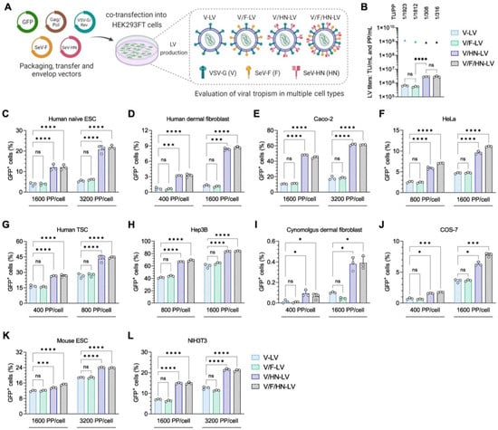 Viral tropism of LVs with VSV-G and SeV envelope proteins. (A) LV particles used in the tropism assay were produced using transfer, packaging, VSV-G/Rev, SeV-F, and/or SeV-HN envelope plasmids in a 2:1:1:1 ratio, as detailed in Table S2. (B) The biological and physical titers of LVs. The bar graphs represent TU/mL, and the triangles represent PP/mL. The ratio of TU to PP is shown above each set of LV titers. (C–H) Human cells: (C) human naïve embryonic stem cells (ESCs), (D) human primary dermal fibroblast cells, (E) colorectal adenocarcinoma cell line Caco-2, (F) human cervical carcinoma derived cell line HeLa, (G) human trophoblast stem cells (TSCs), and (H) human hepatocellular carcinoma cell line Hep3B; (I,J) monkey cells: (I) cynomolgus monkey primary dermal fibroblast cells and (J) African green monkey kidney fibroblast-like cell line COS-7; and (K,L) mouse cells: (K) mouse embryonic stem cells (ESCs) and (L) mouse embryonic fibroblast cell line NIH3T3, were transduced with four types of LV particles at the indicated PP/cell. The infection efficiency was measured 2–4 days post-infection by counting GFP-positive cells via flow cytometry. Data are expressed as the mean ± SD with technical replicates (n = 3). Ordinary one-way ANOVA with Tukey post-hoc test was conducted for (B) and ordinary two-way ANOVA with Tukey post-hoc test was conducted for (C–L). **** p < 0.0001, *** p < 0.001, and * p < 0.05; ns, not significant.