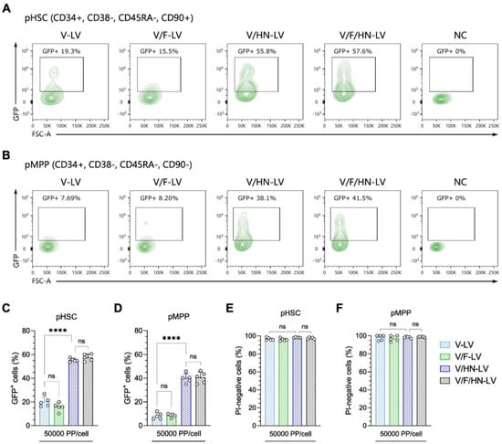 Improvement in the transduction efficiency of VSV-G and SeV-HN pseudotyped LVs in human hematopoietic stem and progenitor cells. (A,B) Representative flow cytometry plots of the GFP-positive rate in (A) with the human phenotypic hematopoietic stem cell (pHSC) population, defined as CD34+, CD38−, CD45RA−, and CD90+, and (B) with the phenotypic multipotent progenitor (pMPP) cell population, defined as CD34+, CD38−, CD45RA−, and CD90−. Human cord blood cells were infected with the four types of concentrated LV particles at 50,000 PP/cell, with production as shown in Table S5. The GFP-positive cells (C,D) and propidium iodide (PI)-negative cells (E,F) were evaluated by flow cytometry 2 days after transduction. The gating strategy is available in Supplemental Figure S7. Data are expressed as the mean ± SD with technical replicates (n = 5) and ordinary one-way ANOVA with Tukey post-hoc test was conducted. **** p < 0.0001; ns, not significant.
