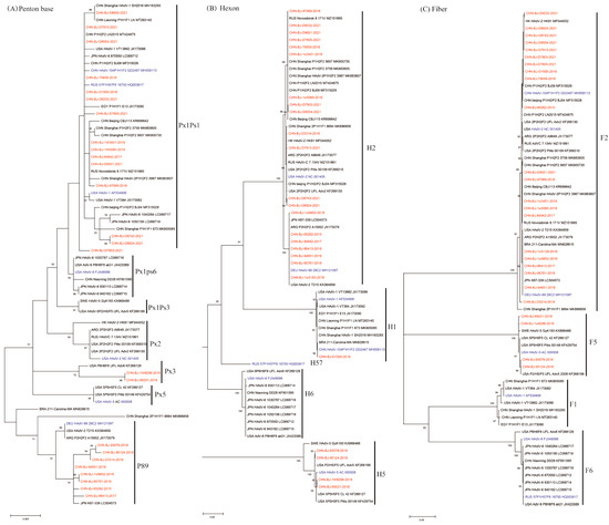 Nucleotide sequences of penton base, hexon and fiber genes from Sino Geno Max were assembled by Lasergene’s DNA SeqMan software (version 7.1.0, DNA Star Inc. Madison, WI, USA), and subjected to BLAST analysis (https://blast.ncbi.nlm.nih.gov, accessed on 1 April 2024) to identify the most closely related genotypes of HAdVs. Multiple sequence alignment was carried out using MAFFT software. The typing of these sequences was determined by constructing phylogenetic trees with the penton base, hexon and fiber genes of reference sequences (Table S1 in attachment) retrieved from GenBank, respectively, according to the maximum likelihood method and 1000 bootstrap pseudo-replicates implemented in MEGA X with the pairwise deletion of gaps and missing data. In order to get concise phylogenetic trees, the annual representative sequences of different types were selected from sequences with high identity (>85%) and in one cluster. Homologous recombination was clearly involved in the molecular evolution of species A, B, and D, but little is known about the molecular evolution of species C. A genetic recombination analysis was carried out by Mao et al. on 201 HAdV-C strains from 9 provinces in China between 2000 and 2016 using three capsid proteins. Mao’s data revealed that phylogenetic analysis of the penton base sequences of HAdV-C revealed six genetic groups (labelled as Px1-6), which showed that the penton base had more variation than previously thought. However, multiple newly divergent sequences of species C co-circulated across mainland China [15]. Therefore, phylogenetic trees of species C were constructed more carefully by comparing them with the newly identified sequences of species C.
