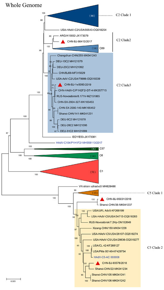 The ML (maximum likelihood) tree of the whole genome sequences of the four strains isolated in this study and 180 whole genome sequences of HAdV-C from GenBank constructed using the maximum likelihood method of MEGA X with 1000 bootstraps. Red triangles in clusters C2 clade 3 and C5 clade 2 represent sequences from the study.