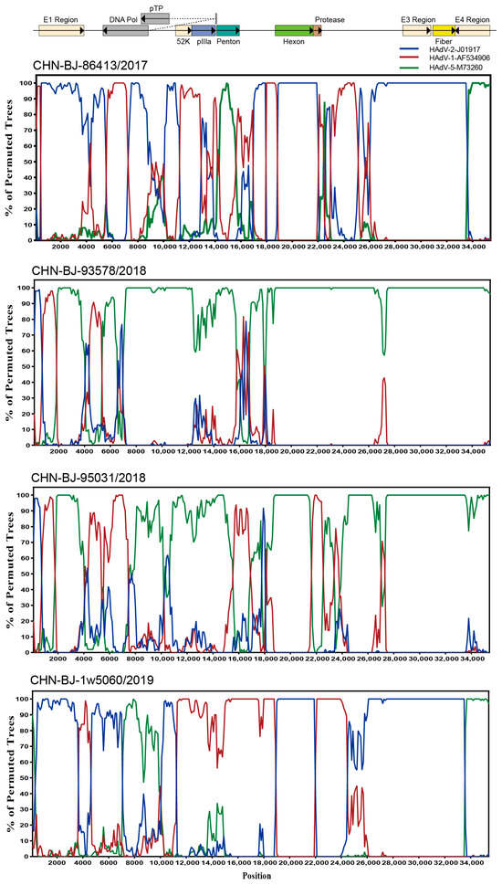 To explore the breakpoints of these four HAdV-C isolates, the Simplot software tool was used. The results revealed that multiple recombination events existed among the four HAdV-C isolates from the whole genome sequences of HAdV-1, HAdV-2 and HAdV-5 (Figure 5) with strain CHN-BJ-86413/2017 typed as C89, CHN-BJ-1w5060/2019 as C104, and CHN-BJ-93578/2018 and CHN-BJ-95031/2018 unidentified (Table S3).