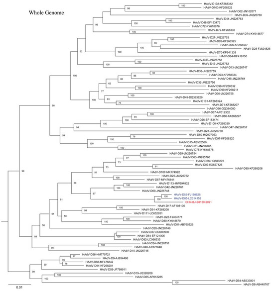 Nucleic acid was extracted from purified virus clones using the QIAamp MinElute Virus Spin Kit (Qiagen GmbH, Düsseldorf, Germany) according to the manufacturer’s instructions. Then, mNGS was conducted on the Novaseq 6000 sequencing platform of Illumina (Illumina, San Diego, CA, USA), in which the 2 × 150 cycles paired-end sequencing protocol and 10 GB data yield of each library were chosen. Sequence data were trimmed using the Fastp program [16]. While human reads were removed using Bowtie2 [17], non-human reads were assembled using Trinity (version 2.8.4) and were taxonomically annotated using Kraken2 (version 2.0.8-beta) [18,19]. Finally, genomes were polished by the BLASTn package, and genome termini were manually checked and corrected using a map of the reads against the HAdV reference GenBank sequences. All sequences were named in the style of CHN-BJ-No./year.