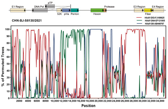 The complete HAdV-D genome of the strain (CHN-BJ-S8130/2021 isolated from a 21-day-old neonate with a complete genomic sequence of 35,131 bp and a GC content of 56.15% showed a closer relationship with HAdV-D53 and D85 in phylogenetic analyses containing reference sequences from GenBank (Figure 6). SimPlot analysis revealed that CHN-BJ-S8130/2021 was determined as HAdV-P22H8F8 concerning the sequence of the penton base, hexon, and fiber genes, a novel recombinant genotype according to the current nomenclature rules based on the three major capsid genes.