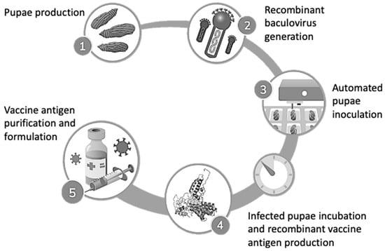 In the baculovirus expression system, not only cultured cells but also insect larvae and pupae can be used for protein production. Implementing living insect larvae and pupae as single-use biofactories offers a cost-effective means to improve antigen expression levels [,]. The CrisBio® technology, combining T. ni pupae with recombinant AcMNPV-derived baculoviruses (such as Fatrovax RHDV by Algenex and Fatro), represents a groundbreaking approach. A schematic representation of the manufacturing process of recombinant subunit vaccines with CrisBio® technology is shown in Figure 1. For instance, in influenza, expressing the HA ectodomain fused with specific signals in T. ni larvae or Spodoptera litoralis larvae resulted in significantly higher expression levels compared to Sf21 cells. These insect-derived HAs induced protective immunity in vaccinated mice [].