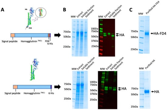 The soluble extracts obtained from the pupae infected under optimal conditions were employed for purifying the two HA protein versions via affinity chromatography, facilitated by the His tag in both constructs. Remarkably, we achieved purification levels exceeding 70% for the HA proteins in a single step (Figure 2C). The productivity of the HAFD4 and HA proteins in the crude pupae extracts, as well as their yields after purification under the established experimental conditions, were found to be highly similar.