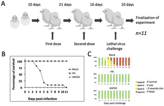 (A) Schematic representation of the chicken vaccination procedure and challenge with the highly pathogenic virus, H7N1 strain (A/chicken/Italy/5093/99). (B) Number of poultry belonging to the different experimental groups that survived at different days post-challenge with the virulent influenza virus. (C) Percentage of the poultry belonging to the experimental groups showing different pathology scores.