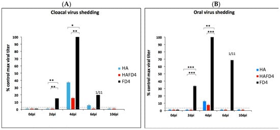 (A) Cloacal and (B) oral virus shedding of the chickens belonging to the experimental groups at different days post-challenge with the highly pathogenic virus, H7N1 strain (A/chicken/Italy/5093/99). Student t-test: * p < 0.05, ** p < 0.01, *** p < 0.001.