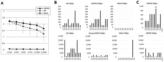 To assess the humoral immune response elicited in the HA- and HAFD4-vaccinated poultry groups in comparison to the mock-vaccinated control group, we evaluated the IgY antibody titers using an ELISA test. The sera that recovered 35 days after the initial vaccination dose were subjected to several dilutions for ELISA analysis just before the virus challenge. The results revealed that all poultry vaccinated with both CrisBio®-derived HA proteins developed high IgY antibody titers (>1:2000) against a homologous HA7 protein (Figure 5A). While both HA and HAFD4 vaccines effectively induced a humoral response against the homologous H7, the HAFD4 appeared more immunogenic than the HA, eliciting an increased antibody response compared to the HA.