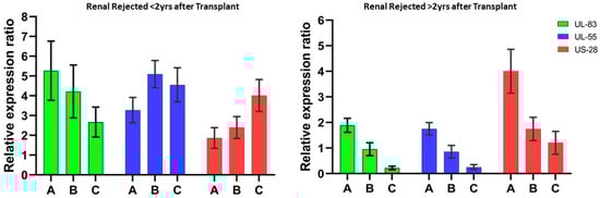 Relative mRNA expression of HCMV early immune evasion tegument protein and latency-associated genes showed very distinctive expression profiling in both early renal rejected (<2 years) and late renal rejected patients (>2 years). The study was conducted during the initial observation of renal rejection confirmatory tests (antibody-mediated or tissue biopsy) and was followed up in the initial and 3-month intervals up to 6 months. It has been observed that during early rejection cases, UL-83 (expression ratios of 5.26 and 3.27) and UL-55 genes (expression ratios of 4.21 and 5.09) were comparatively high (p < 0.001) compared to HCMV latency-related gene US-28 (expression ratios of 1.86 and 2.39), whereas in late renal rejected cases it was found that the relative expression of US-28 (ratios of 4.02 and 1.76) at the initial observation was significantly higher (p < 0.001) in comparison with HCMV genes UL-83 and UL-55 (expression ratios of 1.39 and 0.95 and 1.75 and 0.85, respectively) (Figure 1).